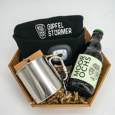 Inspiriert von den Weitblicken und Pfaden der schönen Natur rund um die älteste Kurstadt der Brandenburg Bad Freienwalde, haben wir für Sie die besten Produkte aus unserer Gipfelstürmerline in einen Korb liebevoll zusammengepackt. Dieser Geschenkkorb ist das perfekte Präsent für jeden Anlass. Enthalten sind eine LED-Gipfelstürmer Wandermütze, eine Edelstahl-Karabiner Tasse, welche sich perfekt für den nächsten Ausflug in die Natur eignet, und ein leckeres Moor Ochs Bier in den Sorten Heller Bock oder Schwarzbier.