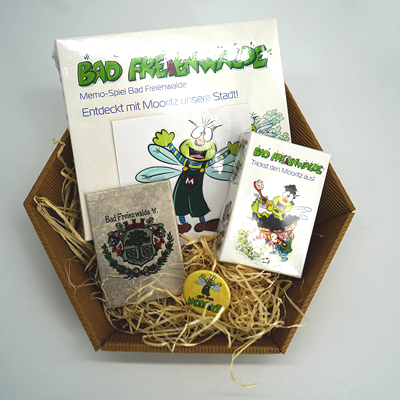 Enthalten sind ein Mooritz Memo-Spiel, ein Kartenspiel "Trickst den Mooritz aus", ein Magnet(im Moment nicht Lieferbar,deshalb ist der Korb 3 Euro günstiger als regulär 15,50 €), ein Mooritz.-Button, ein Mooritz-Aufkleber und eine kleine Bad Freienwalder Schokolade.